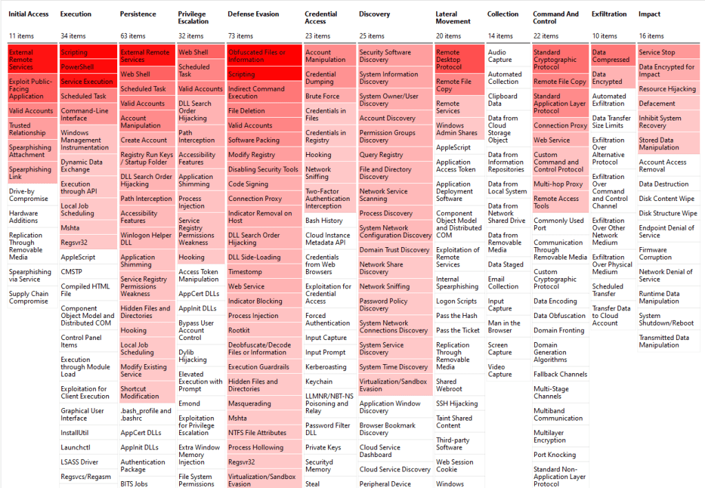 The figure below depicts the relative prevalence of threat Tactics, Techniques & Procedures (TTPs), courtesy of the Detect Tactics, Techniques & Combat Threats (DeTT&CT) team and Fireeye’s M-Trends report. The TTPs are mapped on the MITRE ATT&CK navigator. The darkness of the red shading represents the TTP prevalence.