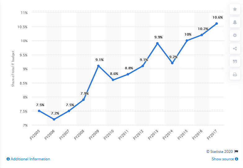 A good metric to look at is IT security spending as a percentage of the overall IT budget because it is a better indicator of productivity than percentage growth in absolute terms. Optimally, you would want security spending as a percentage of total IT spending to be constant or even decreasing relative to IT spending. Instead, we have this: