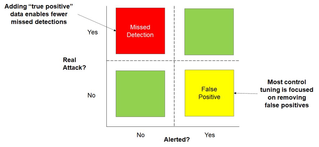Let’s explain using the figure below. The x-axis represents whether an alert was generated. The y-axis represents whether an attack actually happened. The green boxes can be thought of as “known knowns.” Starting on the bottom left quadrant, if there is no attack and no alert, this is an expected condition. Similarly, in the upper right quadrant, when true attacks occur, they should be alerted.