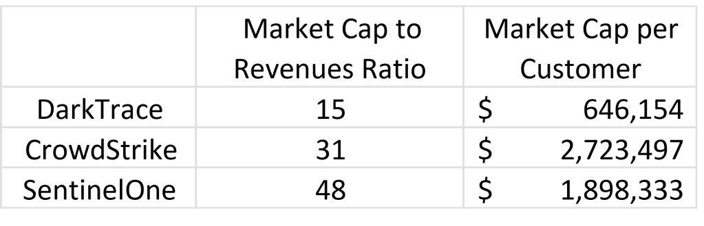 A good indication of whether a stock price is disconnected from economic growth is market cap per customer. In its last financial statement, SentinelOne reported 6,000 customers. At the current market cap of $11.39B, that works out to almost $1.9M of market cap per customer. Do you know how many of SentinelOne’s customers provide over $100K of revenues per year? Under 500. Not terribly impressive for a company that 1) is in a crowded market, 2) lost $67M on revenues of $237M in its last quarter, and 3) has gross margins ten percent lower than CrowdStrike’s.