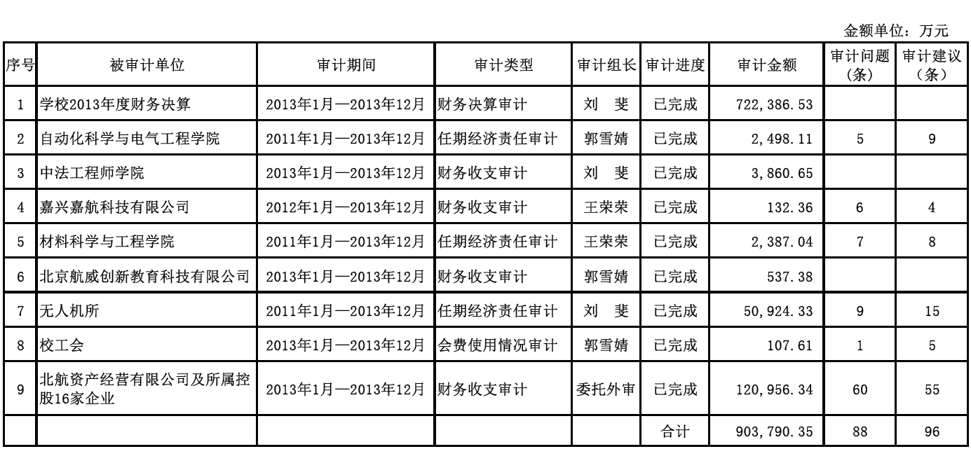 2014年,审计处共完成了9项财务审计项目(1项委托社会中介机构外审),审计金额共计903,790.35万元,查出审计问题88条,提出审计建议96条。现公告如下: