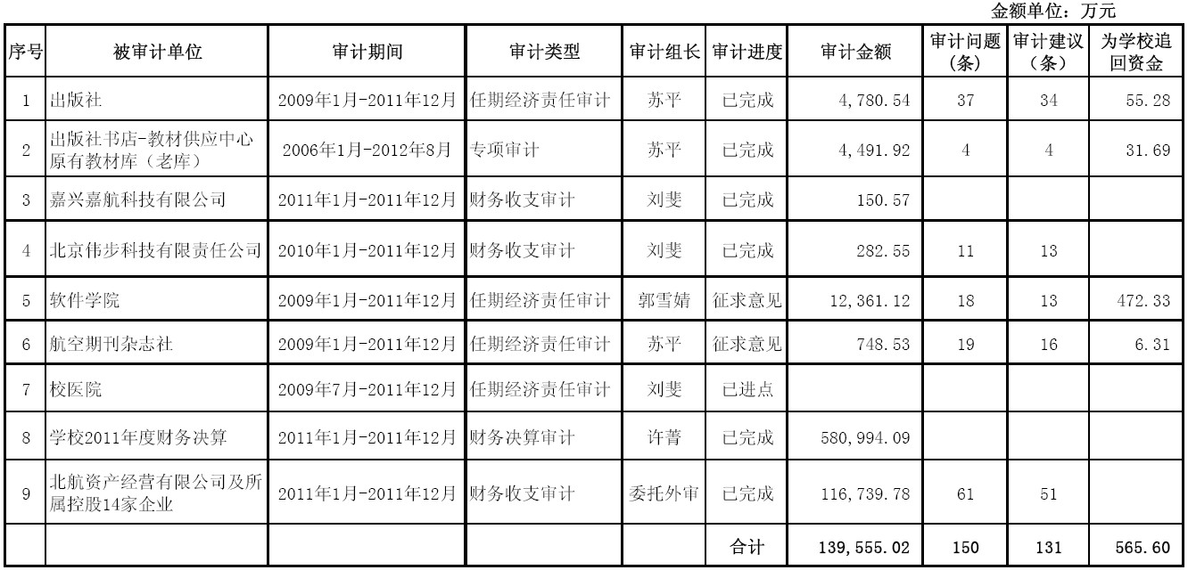 截止 2012年12月27日 ,审计处共进行了9项财务审计项目,已完成6项(1项委托社会中介机构外审),尚在征求意见阶段2项,已进点1项。审计金额共计139,555.02万元,查出审计问题150条,提出审计建议131条,为学校追回资金565.60万元。现公告如下: